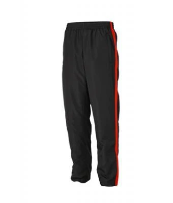 Pánské tepláky z lehkého prodyšného materiálu odolného proti větru a vodě, celoplošná podšívka ze síťoviny, boční kontrastní pruhy, 2 kapsy na zip, pružný pas se šňůrkou na stažení, zipy na nohavicích, reflexní potisk