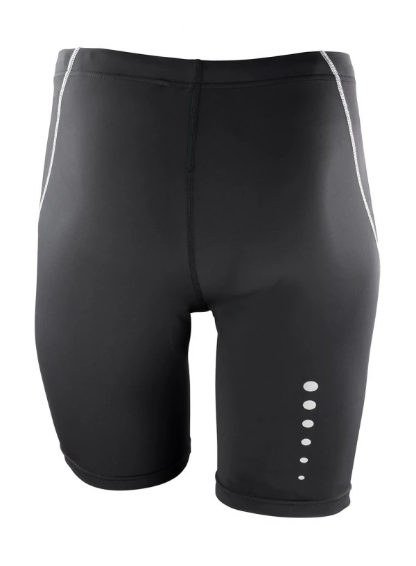 Prodyšné, elastický pas a stahovací šňůra, ploché boční švy, panely s kontrastním stehem na nohavici, vnitřní kapsa na zadní středové části, reflexní logo SPIRO na levém stehně a 5 teček dole na zadní části pravé nohavice, vhodné pro transferový tisk a výšivku.
