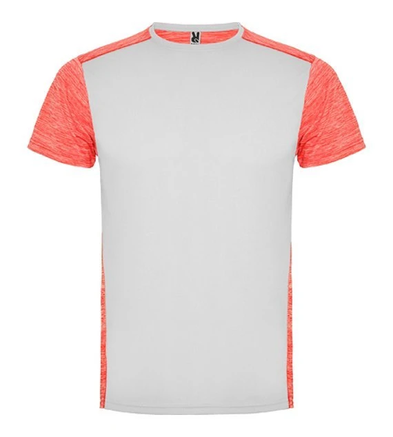 Krátké rukávy, kulatý výstřih, kombinace dvou polyesterových tkanin, přední strana polyester honeycomb a polyester space dye na zadní straně, prodloužená zadní strana, odstranitelná cedulka, prodyšný materiál, funkční materiál, vhodné pro potisk sublimací.