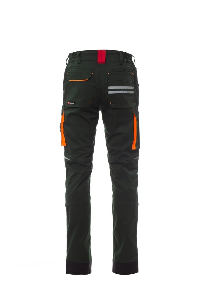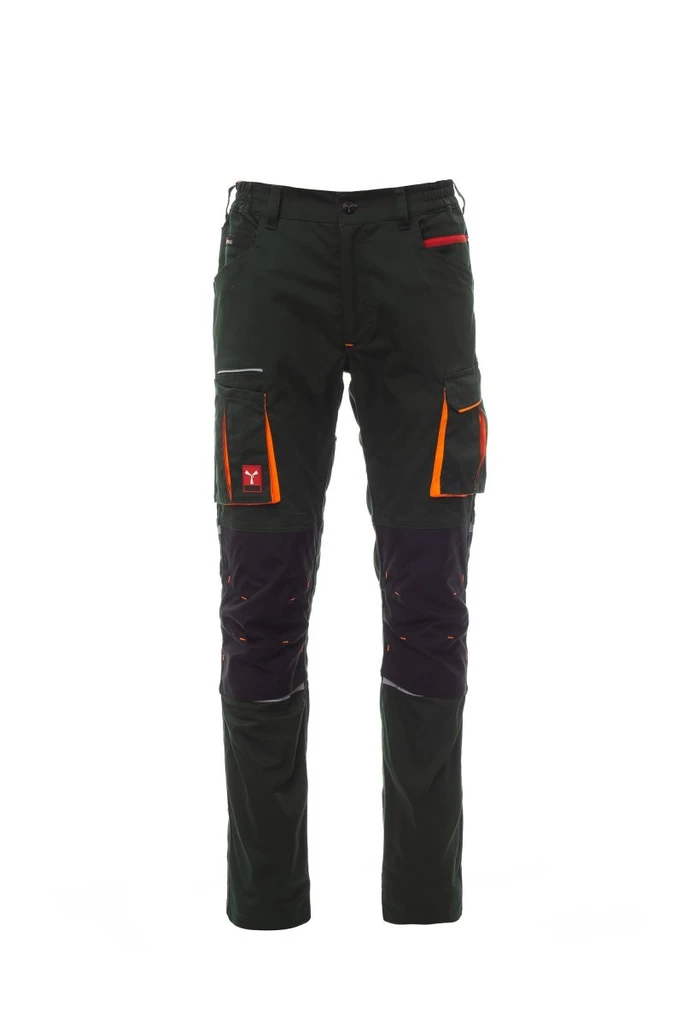Unisexové kalhoty, stretch, celoroční, gumičky na bocích a poutka na pásek v pase, zapínání na zip a přizpůsobený knoflík. Na přední straně kalhoty mají dvě tvarované kapsy, na pravé straně kapsičku na mince a na levé straně bezpečnostní kapsičku na zip. Na přední straně levé nohavice je kapsa s klínkem, klopa na suchý zip a pouzdro na jmenovku. Na přední straně pravé nohavice je kapsička na telefon s reflexním lemem a kapsička s klínkem. Obě nohavice mají připevnění pro chrániče kolen z Nylon Oxford 500D, z kontrastní látky (s rozepínáním zezdola) a reflexní pásky, které signalizují rozepnutí. Na zadní straně je kapsa s malou klopou na suchý zip a kapsa bez klopy se 2 reflexními páskami, kapsička na svinovací metr (pravá nohavice), reflexní vložky ve výšce kolen (obě nohavice), patní chrániče z kontrastní látky (obě nohavice). Dále jsou přítomny: - prošívání trojjehlou v rozkroku, na vnitřní a vnější straně nohavic - kontrastní výztuže na různých místech. Italské prostřední velikosti 48-50-52 mají běžnou vnitřní délku nohavic 82 cm.