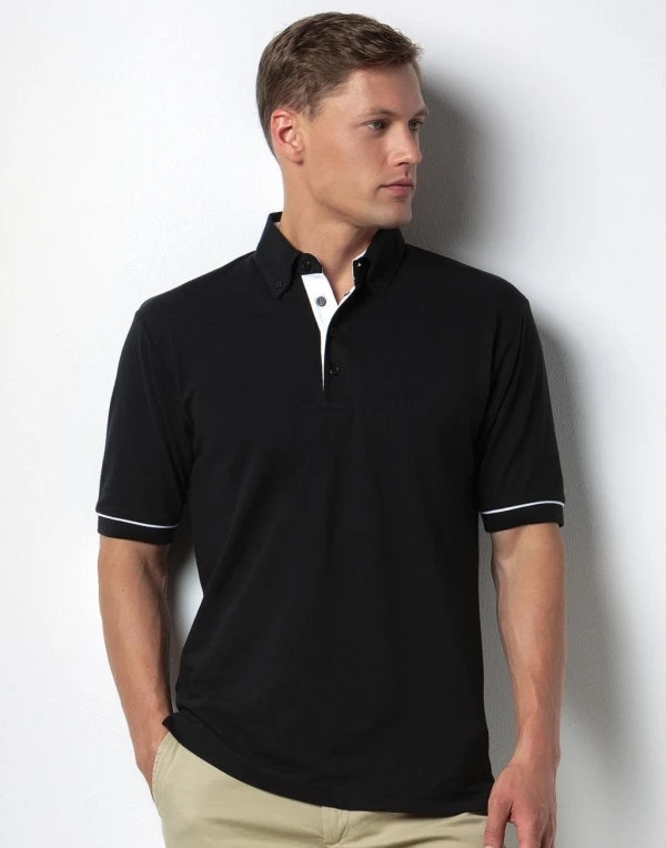 Stojatý límeček, kontrastní stojáček z vnitřní strany, páska za krkem a rozparky, 1x1 žebrované manžety s kontrastní proužkem, 2 náhradní knoflíky, všitý štítek.