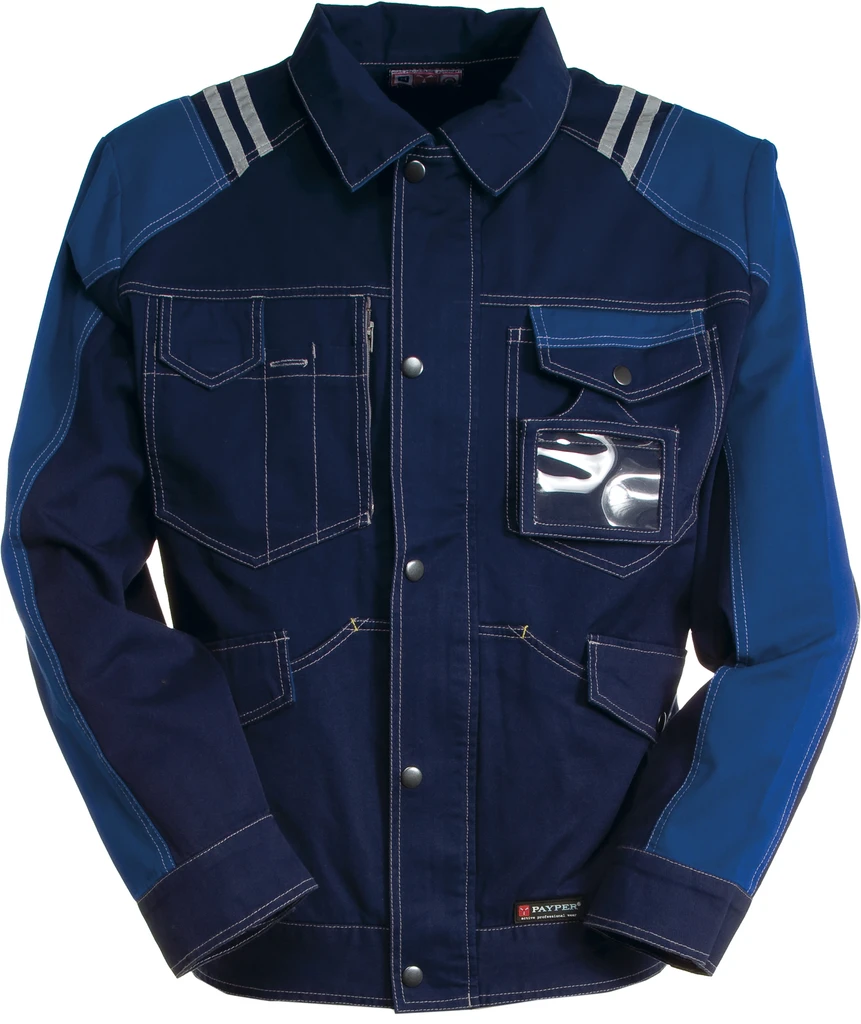 V džínovém stylu, kontrastní vsadky a prošití, přední zapínání na zip s klopou na cvočky, vypasovaný střih, nastavitelné manžety, nastavitelný pas na cvoček, 2 klokaní kapsy se speciálním zavíracím systémem, 2 náprsní kapsy, odnímatelná jmenovka, reflexní lemování na zádech, reflexní proužky na ramenou