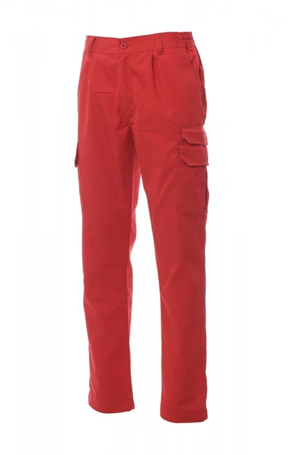 Pracovní kalhoty s mnoha kapsami. Elastický pas s poutky na opasek, zapínání na zip a knoflík. Trojité prošití v rozkroku a na vnitřní straně nohavic, dvě přední kapsy klasického střihu, jedna levá postranní kapsa s klopou, jedna kapsa s bezpečnostním zipem a krycí klopou, jedna pravá postranní kapsa s klopou rozdělená na dvě části na svinovací metr, dvě zadní kapsy, z nichž jedna s uzavírací klopou