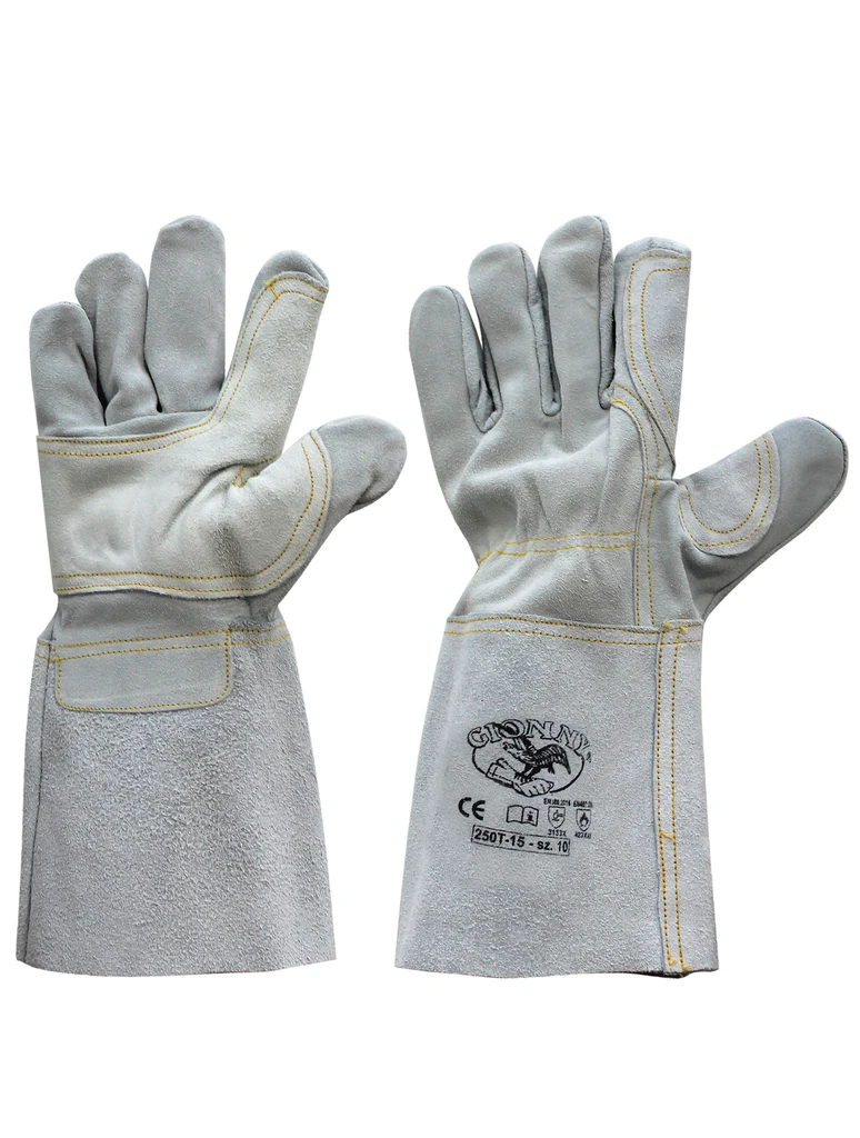 Oblasti použití: vhodné k manipulaci s rozpáleným materiálem; Vyztužená dlaň, palec a ukazováček, ochrana zápěstí, 14 cm široká manžeta z dělené kůže, bytelné, velmi odolné, ochranné, pevné uchopení