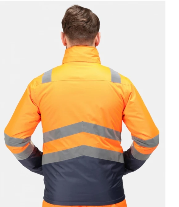 Složení: 100% polyester (300D); Vodotěsná a prodyšná textilie Isotex 10000 z polyesteru 300D s podlepenými švy, odolná tkanina, odolná vůči větru, EN343:2003 A1:2007 třída 3:3, oranžová také splňuje RIS-3279/TOM, EN ISO 20471:2013 + A1:2016 třída 2, skrytá kapuce, izolace Thermo-guard, reflexní šikmý cikcak vzor