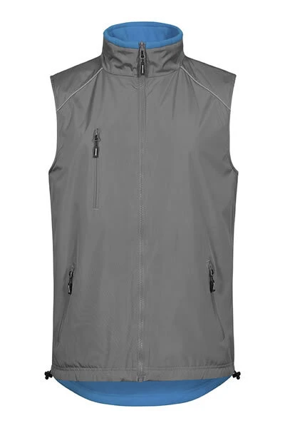 Oboustranná vesta s napoleonovou kapsou na přední straně disponuje dvěmi bočními kapsami na zip. Vesta má našitý kroužek na klíče v boční kapse, reflexní lemování a tahače zipů. Vesta je vybavená tunýlkovou stahovací šňůrkou na lemu se stopkami, zahnutým lemem a neviditelným zipem na ozdobu. Má moderní střih.