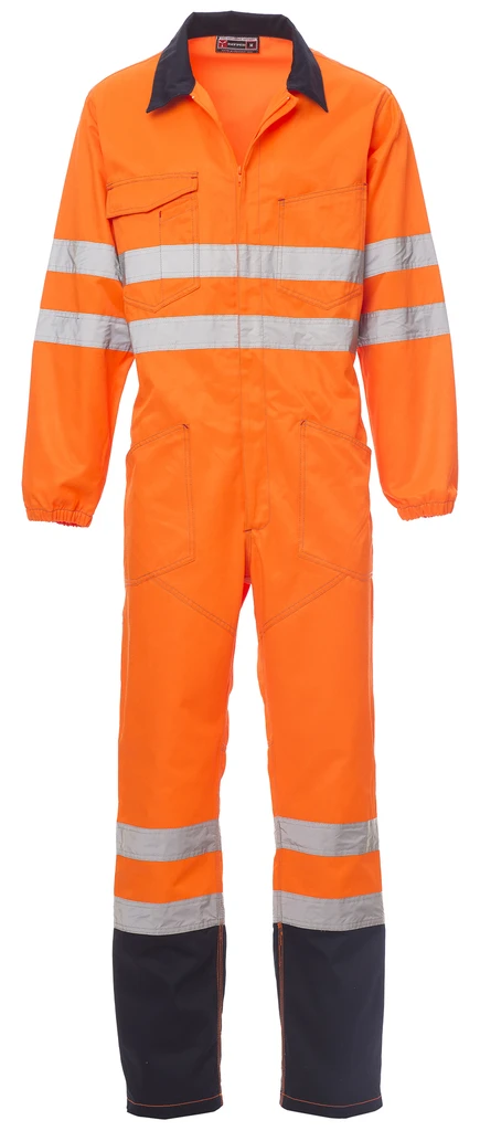 Reflexní pruhy, centrální zip s dvojitým kovovým jezdcem, elastická pas na zádech, trojité švy v rozkroku a na vnitřních nohavicích, 2 velké kapsy, 2 náprsní kapsy (1 s klopou), kapsa na pero, zadní kapsa s klopou, boční kapsa na metr, elastické manžety