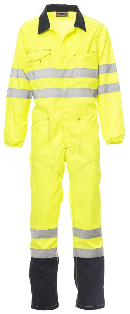 Reflexní pruhy, centrální zip s dvojitým kovovým jezdcem, elastická pas na zádech, trojité švy v rozkroku a na vnitřních nohavicích, 2 velké kapsy, 2 náprsní kapsy (1 s klopou), kapsa na pero, zadní kapsa s klopou, boční kapsa na metr, elastické manžety