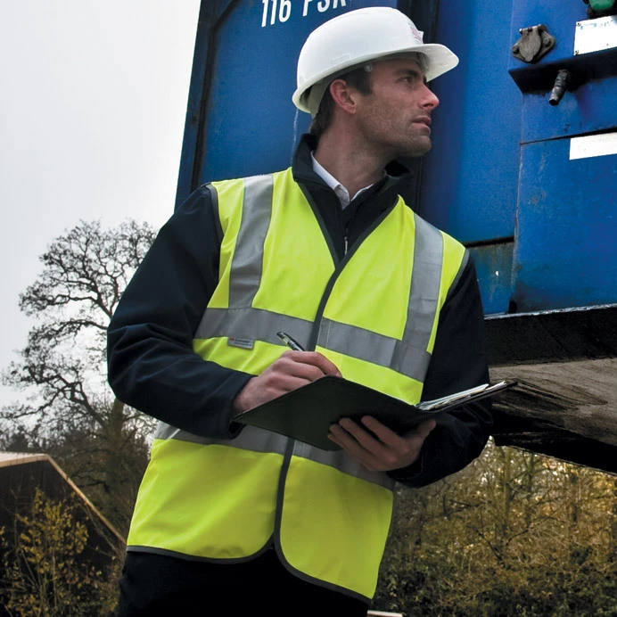 Šedé lemování, zapínání na suchý zip, vzhledem k větším rozměrům ji lze nosit také na oblečení, 50mm reflexní prvky 3M™ Scotchlite™, ISOEN20471:2013, třída 2, v souladu se směrnicí 89/686/EEC.