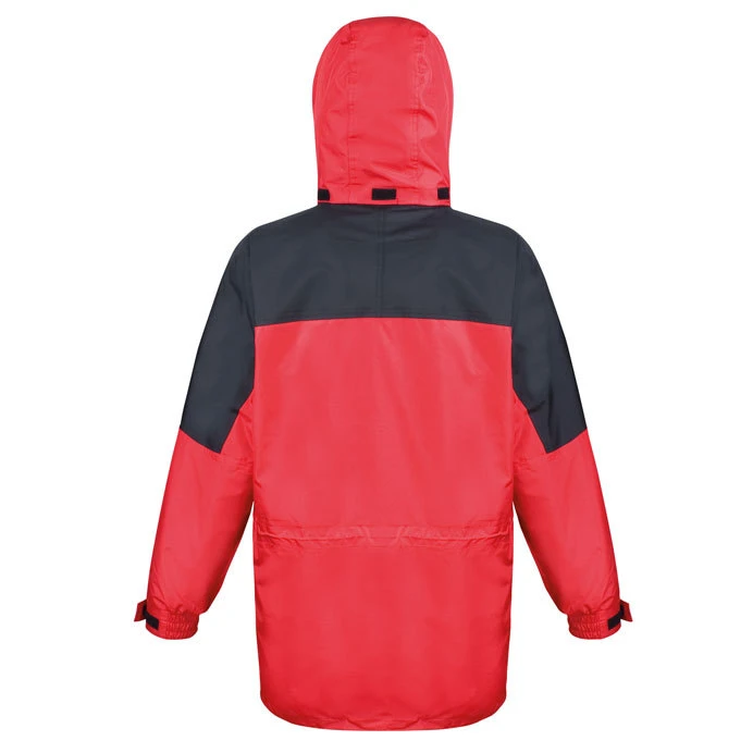 Podlepené švy, voděodolná a větruvzdorná (2.000 mm), límec se skrytou kapucí, oboustranný zip skrytý klopou zapínanou na suchý zip a patentky, elastické manžety nastavitelné pomocí suchého zipu, několik vnitřních kapes s očky pro sluchátka, nastavitelný pas a spodní okraj s elastickou stahovací šňůrkou se zarážkami, přístup pro dekoraci zevnitř na zádech, vhodná pro: vnější strana: výšivku transferový potisk, vnitřní strana: transferový a digitální potisk.