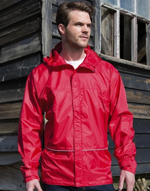 Odolná proti větru a dešti (2,000 mm), kapuce ke schování, plný přední zip s uzavírací vnitřní klopou, 2 síťované lemované zipy uzavírající boční kapsy, manžety nastavitelné pomocí suchého zipu, nastavitelný lem pomocí šňůrky, reflexní lemování kolem spodní části těla, obsahuje recyklovaný materiál, přístup pro dekoraci ze spodního lemu, vhodná pro transferový, přímý, screen, digitální tisk a výšivku.