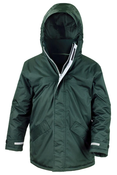 Voděodolná a větruvzdorná (2.000 mm), skrytá trojdílná kapuce v límci se seřizovačem, plné zapínání na 7 mm zip, 2 skryté přední kapsy s klopou a mimořádně teplou fleecovou podšívkou, štítek na jméno v levé kapse, reflexní pásky na nastavitelných manžetách dolní části zad, přístup pro dekoraci na lemu bundy a na levé přední straně, vhodná pro výšivku, přímý, digitální a transferový tisk.