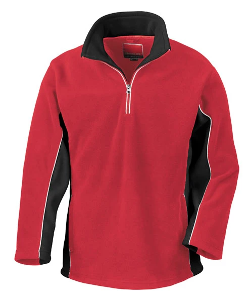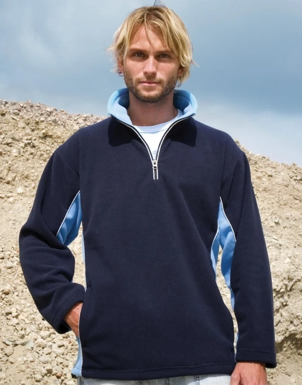 Prodyšná, zpevňující páska za krkem, 1/4 zip, rovné zakončení rukávů bez manžet, postranní kapsy, nastavitelný spodní okraj s elastickou šňůrkou a zarážkami, kontrastní paspulka kolem zipu, na rukávech a po stranách.