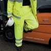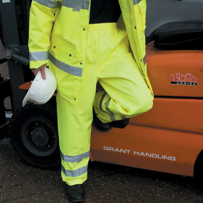 Větruodolné a voděodolné, podlepené švy, pružný pas na šňůrku, 2 boční kapsy a 1 zadní na klíče, dolní okraj nohavice nastavitelný cvočkem, 50mm reflexní pásy, ISOEN20471:2013, třída 1, v souladu se směrnicí 89/686/EEC.