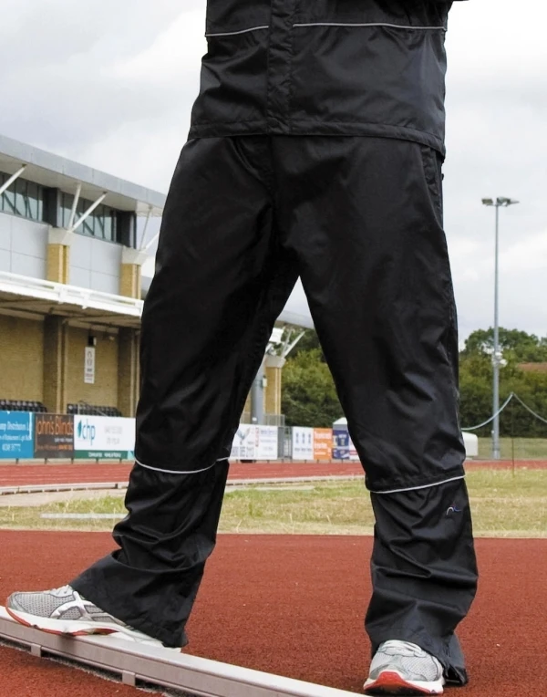 Voděodolné a větruvzdorné (2.000 mm), podlepené švy, 2 kapsy na zip, elastický pás se šňůrkou, boční kapsy na zip, boční větrací otvory na zip, reflexní pásky, zipy ve spodní části nohavic, obsahuje recyklovaný materiál.