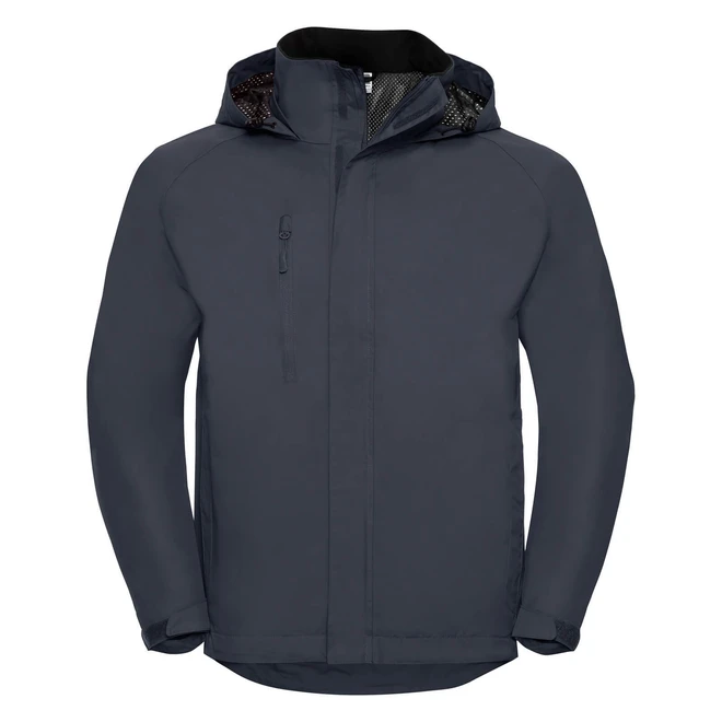 Gramáž: 190 g/m²; Vnější materiál: 100% Nylon Taslan s PV potahem; Vnitřní materiál: síťová podšívka; Voděodolná na 2.000 mm, prodyšná (2000 g/m² v 24 h), trojdílná kapuce v límci, zip ve stejné barvě s ochranou na bradu, skrytá chlopeň proti větru na suchý zip, několik kapes na zip, nastavitelné manžety na suchý zip, lehce prodloužený zadní díl, spodní lem s gumičkou a zarážkami, skrytý přístup pro dekoraci na spodním lemu. Certifikáty: STANDARD 100 by OEKO-TEX®; WRAP