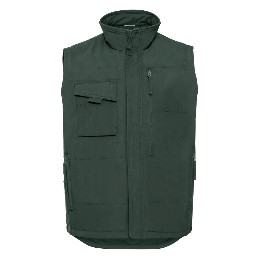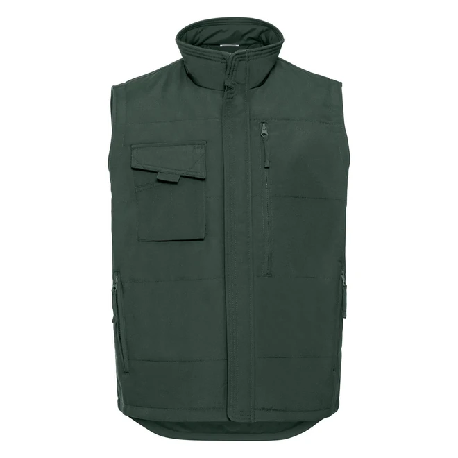 Gramáž: 260 g/m²; Vnější materiál: 65% polyester, 35% hrubá bavlna; Výplň: 150 g/m² polyester , 100% polyester; Pracovní Vesta; Povrchová úprava Teflon™ odolná proti zašpinění, elastické okraje na průramcích, dlouhý zip s klopou, skryté přední kapsy se zipem, pravá náprsní kapsa s praktickými oddíly, vnitřní kapsa pro dokumenty velikosti A4, prodloužená zádová část, možnost pro vyšívání a tisk přes levou přední stranu. Certifikáty: STANDARD 100 by OEKO-TEX®; WRAP