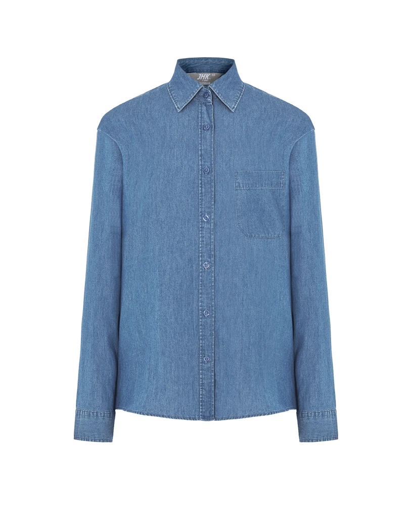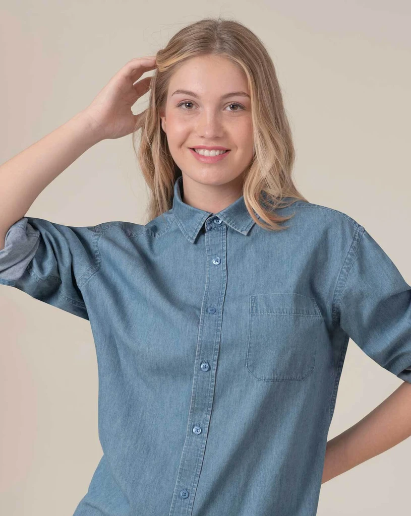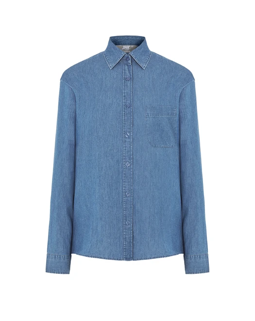Denimová košile pro volný čas. Dlouhý rukáv. Poloodstřižený límec. Kapsa na levé straně.