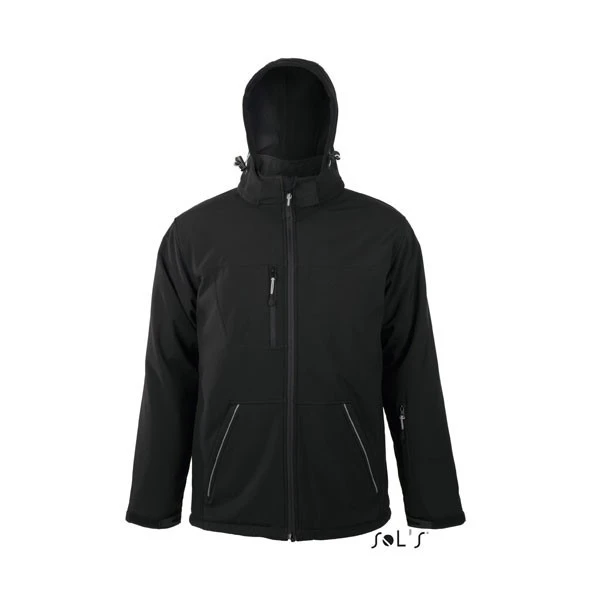 Kvalita: Softshell 340 - 3 vrstvy, Svrchní materiál: 94% polyester - 6% elastan, 100% polyesterová taftová podšívka, 8000 mm vodotěsná a prodyšná membrána, polstrování: 100% polyester; Plně podšito, odepínací kapuce se štítkem, 3 přední kapsy na zip, 1 kapsa na zip na rukávu, 1 vnitřní kapsa na zip, 1 vnitřní kapsa ze síťoviny, vnitřní strečové manžety, zvenku nastavitelné pomocí suchého zipu, elastické šňůrky ve spodním okraji, zipy SBS, šedé kontrastní detaily, přiléhavý střih, reflexní prošívání na přední i zadní části