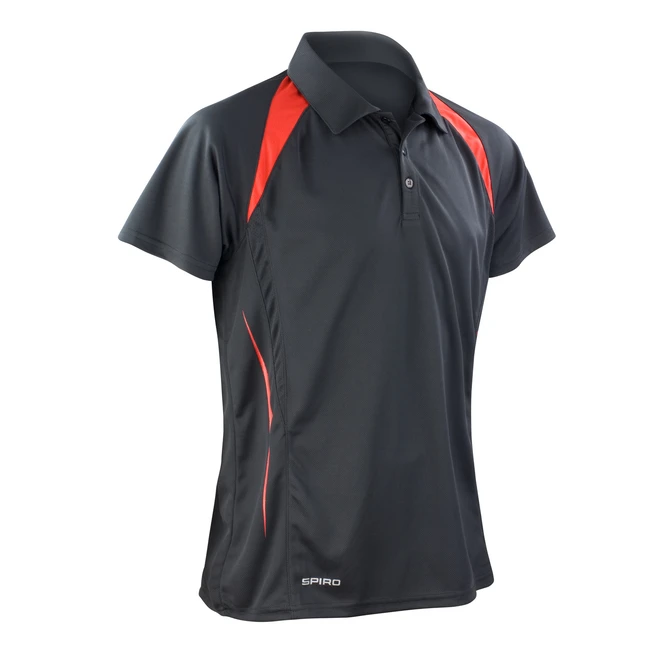 Prodyšná látka Cool-Dry Mesh, struktura včelího plastu, výztužná páska u krku, raglánové rukávy s kontrastními vsadkami, zapínání na 3 knoflíky, postranní prodyšné vsadky, logo Spiro na přední straně dole, prodloužená zádová část, dvojité prošití rukávů a dolního okraje, boční švy, vhodná pro potisk nebo výšivku.