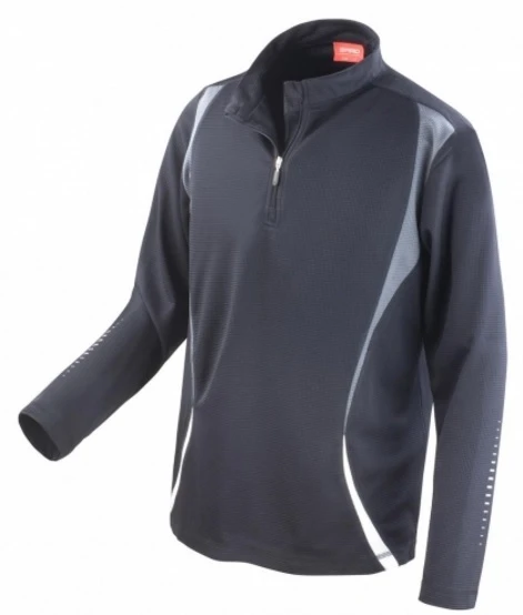 Funkční top s dlouhým rukávem, malý stojací límec, krátký zip u krku s ochranou na bradu, kontrastní vsadky na přední a zadní straně, ozdobné švy v dolní části a na koncích rukávů, boční švy, vhodná pro potisk nebo výšivku.
