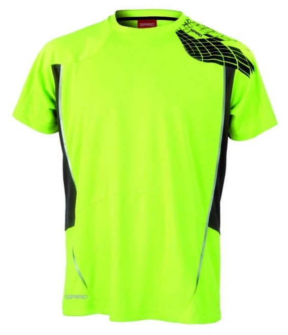 Prodyšná látka, výztužná páska u krku v kontrastní barvě, logo Spiro na levém rameni, na bocích kontrastní vsadky s reflexními pruhy, síťová vnitřní část na zádech pro lepší větrání, dvojité prošití rukávů a dolního okraje, boční švy, vhodná pro potisk nebo vyšívaní.