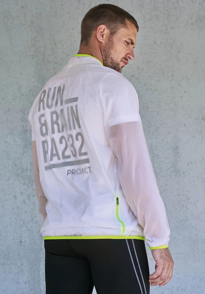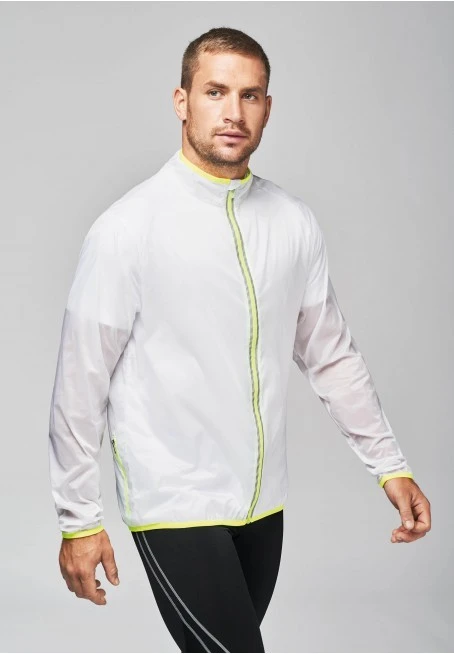 Ultra lehký a rychleschnoucí materiál. Raglánové rukávy. Zářivé elastické proužky na krku, manžetách a kolem spodního lemu. Zip po celé délce. Bundu lze složit do jedné kapsy na zip (K-way® systém se závěsným háčkem).