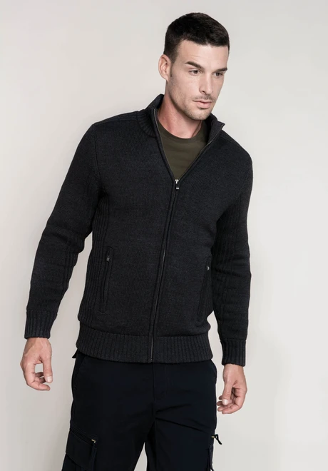Zip po celé délce, 2 kapsy na zip, 2x2 žebrování na ramenou, rukávech a bocích, 2x2 žebrované lemování na límci, manžetách a spodním lemu. Průměrná hmotnost vel.L: 1150 g.