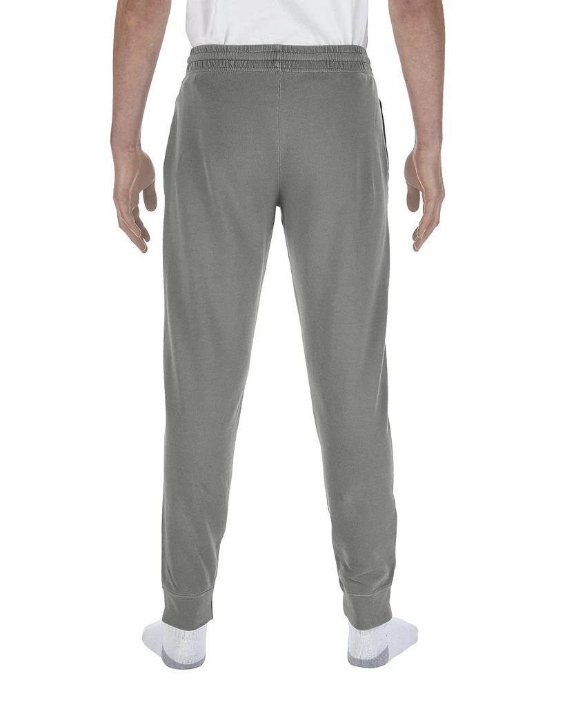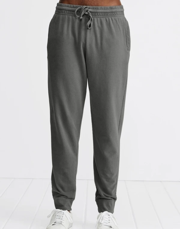Předeprané, jednotlivě barvené (garment dye), vícenásobně prošitý pas s barevně ladící šňůrkou, postranní kapsy, žebrované manžety.