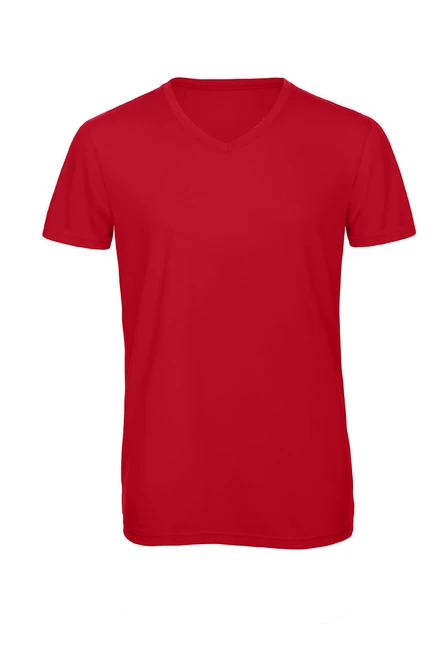 Hedvábně jemná "Triblend" single jersey, výstřih do "V", zpevňující páska od ramena k rameni, límec ze stejné tkaniny, dvojité prošití rukávů a dolního okraje, postranní švy, "B & C No Label" systém pro dokonalou změnu značky, velmi hladký a rovný povrch umožňuje jasný a ostrý tiskový výstup