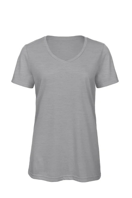 Hedvábně jemná "Triblend" single jersey, výstřih do "V", zpevňující páska u krku, tenký límec ze stejné tkaniny, dvojité prošití rukávů a dolního okraje, postranní švy, "B & C No Label" systém pro dokonalou změnu značky, velmi hladký a rovný povrch umožňuje jasný a ostrý tiskový výstup.