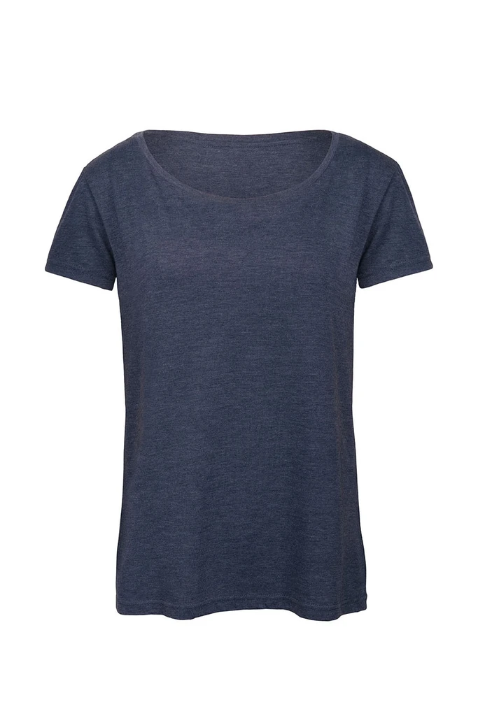 Hedvábně jemná "Triblend" single jersey, zpevňující páska u krku, tenký límec ze stejné tkaniny, dvojité prošití rukávů a dolního okraje, postranní švy, "B & C No Label" systém pro dokonalou změnu značky, velmi hladký a rovný povrch umožňuje jasný a ostrý tiskový výstup.