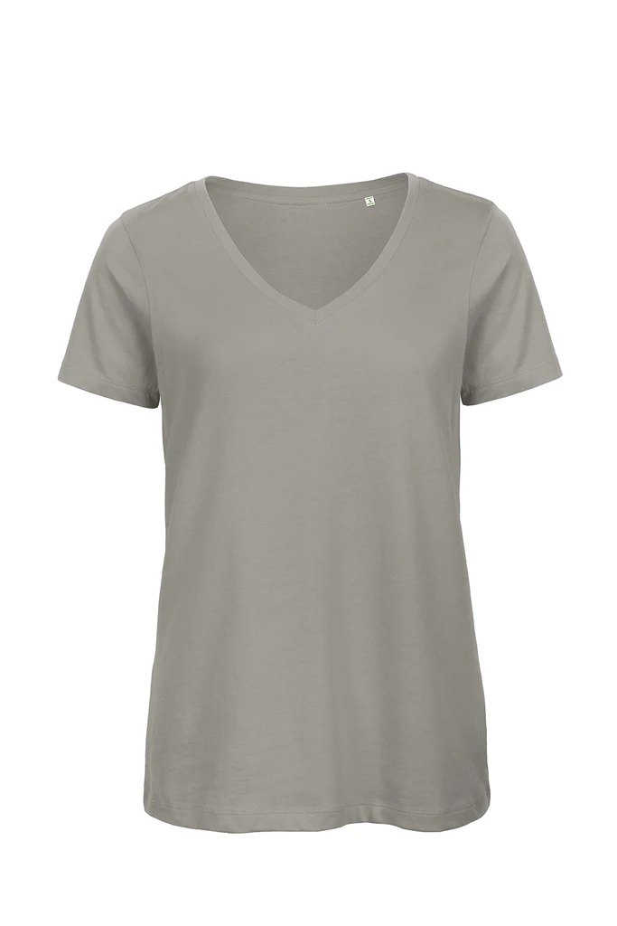 Single Jersey, tenké žebrování, hluboký výstřih do "V", páska u krku, dvojité prošití rukávů a dolního okraje, postranní švy,