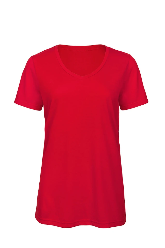 Hedvábně jemná "Triblend" single jersey, výstřih do "V", zpevňující páska u krku, tenký límec ze stejné tkaniny, dvojité prošití rukávů a dolního okraje, postranní švy, "B & C No Label" systém pro dokonalou změnu značky, velmi hladký a rovný povrch umožňuje jasný a ostrý tiskový výstup.