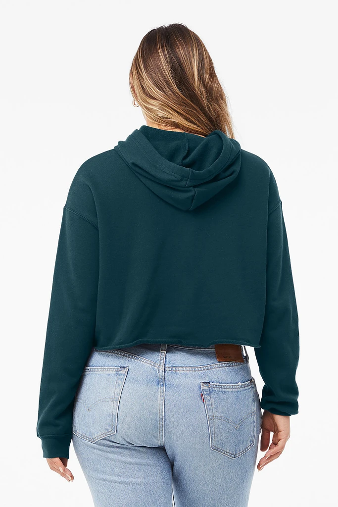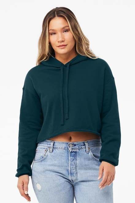Tato trendy dámská zkrácená mikina s kapucí je nutností pro váš podzimní šatník. Díky surovému okraji a obarvenému tak, aby ladil se stahovací šňůrkou, je módní, zatímco polybavlněný česaný fleece přináší bezkonkurenční úroveň pohodlí.