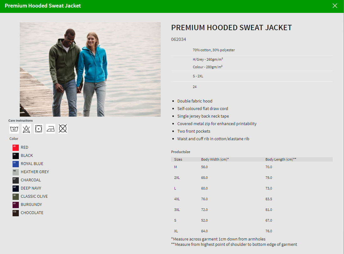Materiál: 70% bavlna, 30% polyester; Gramáž: H/Grey - 260g/m² (barevná- 280g/m²); Dvojitá látková kapuce, jednobarevná plochá stahovací šňůrka, pásek na zadní straně krku z jednolícního žerzeje, krytý kovový zip pro lepší potisk, dvě přední kapsy, žebrování v pase a manžeta z bavlny/elastanu; Certifikáty: STANDARD 100 by OEKO-TEX®; WRAP