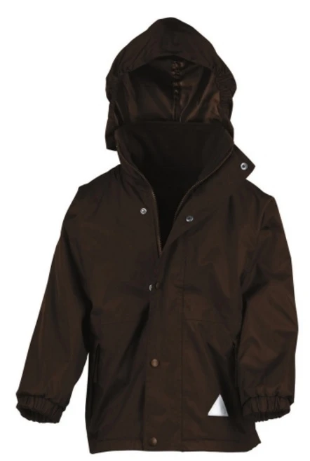 Voděodolná a větruvzdorná (4.000 mm), dvojitě prošité podlepené švy, polyesterová strana je navíc opatřena knoflíkovou légou s ochranou proti větru, kapuce v límci (se zipem), dvojcestný propínací zip, elastické manžety, boční kapsy se zipem, v kapse štítek na jméno, otvor v lemu pro přístup pro dekoraci.