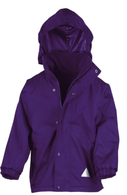 Voděodolná a větruvzdorná (4.000 mm), dvojitě prošité podlepené švy, polyesterová strana je navíc opatřena knoflíkovou légou s ochranou proti větru, kapuce v límci (se zipem), dvojcestný propínací zip, elastické manžety, boční kapsy se zipem, v kapse štítek na jméno, otvor v lemu pro přístup pro dekoraci.