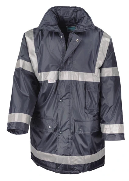 Švy nepropouštějící vodu, vnitřní kapsa, velké skryté vnější kapsy s patentními knoflíky, začleněná kapuce, zip a knoflíková léga s patentními knoflíky, reflexní proužky 3M vpředu a vzadu, zip v zádové vložce pro dekoraci.