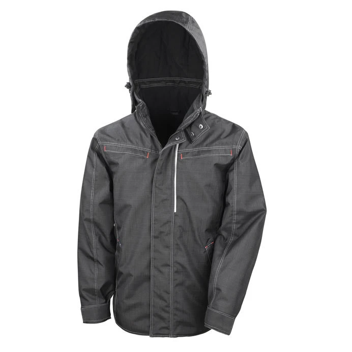 Prošívaná part-fleece podšívkou, prodyšná (2,000 gsm do 24 hodin) a voděodolná (1,500 mm), podlepené švy, odnímatelná kapuce v stojáčku, velký dvoucestní zip s uzavírací klopou, zaměnitelná barva úchytky na zipu, 4 vnější a 2 vnitřní kapsy na zip, D- kroužek, kontrastní dvojité prošití s cvočky, manžety nastavitelné na suchý zip, tvarovaný módní zadní panel, nastavitelný lem, reflexní detail.