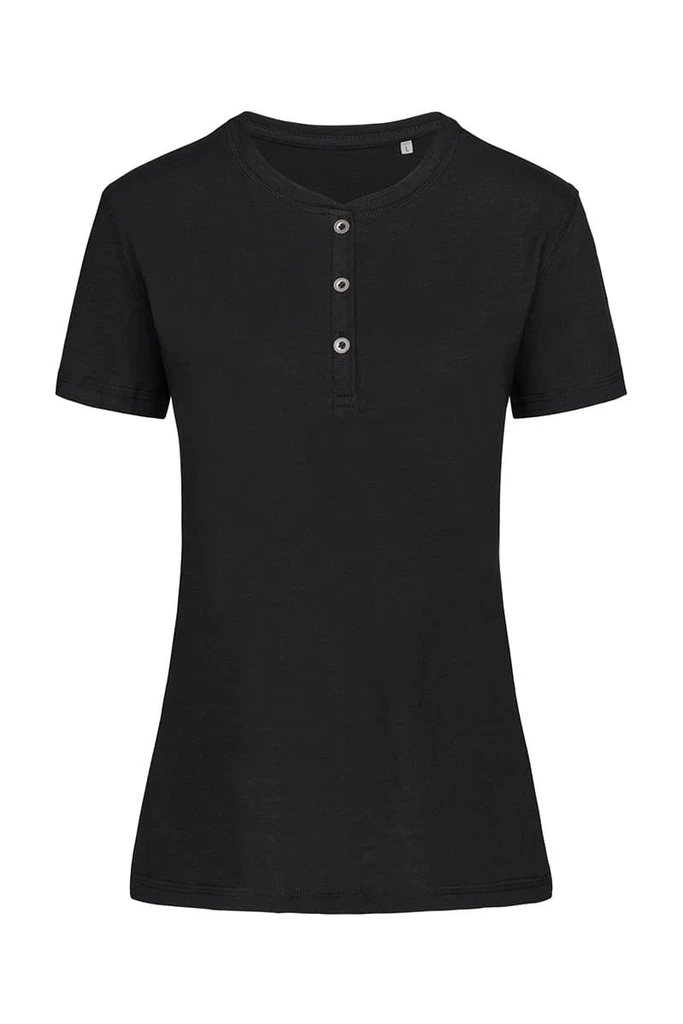 Materiál: 100% prstencově spřádaná bavlna, kluzná příze; jednolícní žerzej; Gramáž: 140 g/m²; Módní dámské tričko na knoflíky, měkký materiál strukturovaného vzhledu, kulatý výstřih, ozdobné ploché švy, 3 široké kovové knoflíky, žebrovaný límec, boční švy, štítek s informacemi o údržbě v postranním švu + malý štítek velikosti v límci, lze prát při 40 °C; Certifikát: STANDARD 100 by OEKO-TEX®