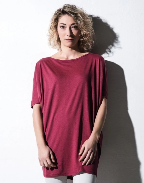 Široký kulatý výstřih, dlouhé rukávy (batwing) s dvojitými švy na koncích, středový šev na horní části zad, dlouhý a volný střih, snadná změna značky.