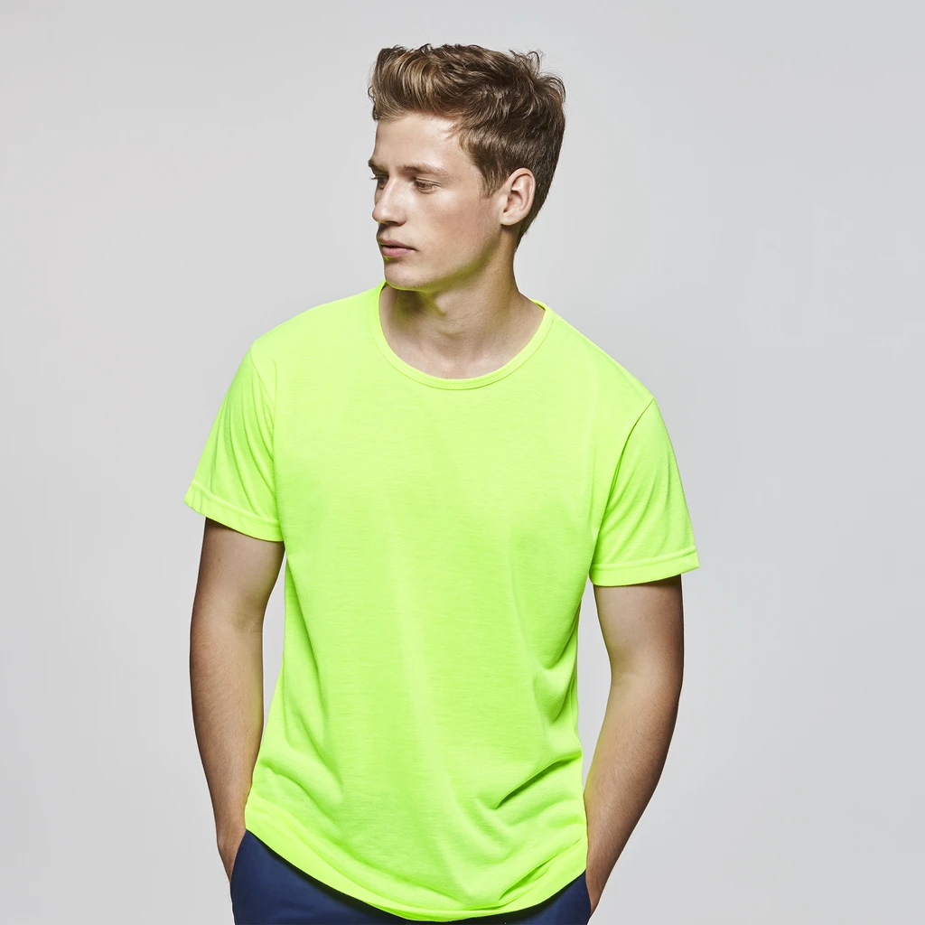 Krátký rukáv, v fluorescenčních barvách, kulatý průkrčník, zpevněné švy na průkrčníku a na ramenou, vyrobeno z polyesteru, na omak působí jako bavlna, odlepovací etiketa, vhodné pro potisk sublimací, dostupné velikosti i pro děti.