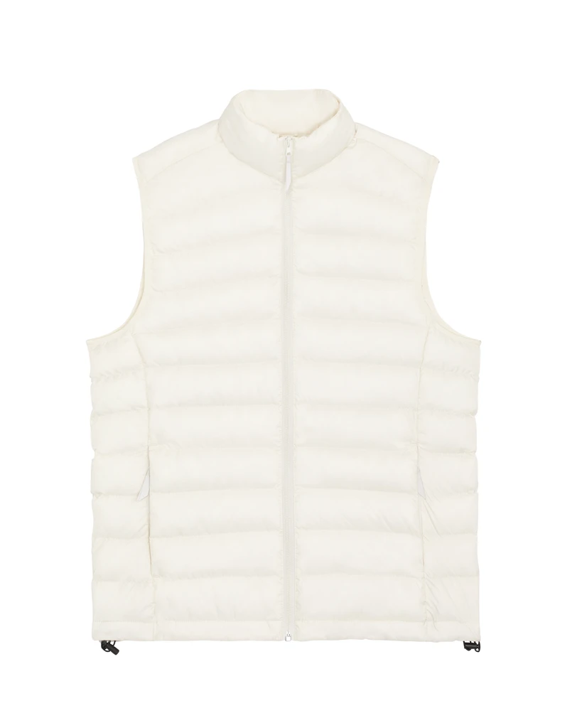 Materiál: 100% recyklovaný polyester, DWR bez fluoru; Gramáž: 75g/m²; Přiléhavý střih, bez rukávů, vysoký límec, obrácený nylonový zip vpředu uprostřed, průhmatové kapsy na zip s extra stahovákem, zavazování elastickou páskou v průramku, plně prošívaná, boční panely pro lepší tvar, vnitřní vázané švy, spodní lem s nastavitelnou plastovou zarážkou a elastickou šňůrkou; Certifikáty: Global Recycled Standard (GRS), Fair Wair, STANDARD 100 by OEKO-TEX®, Peta - Approved VEGAN