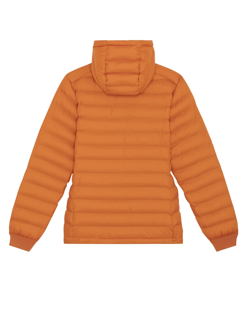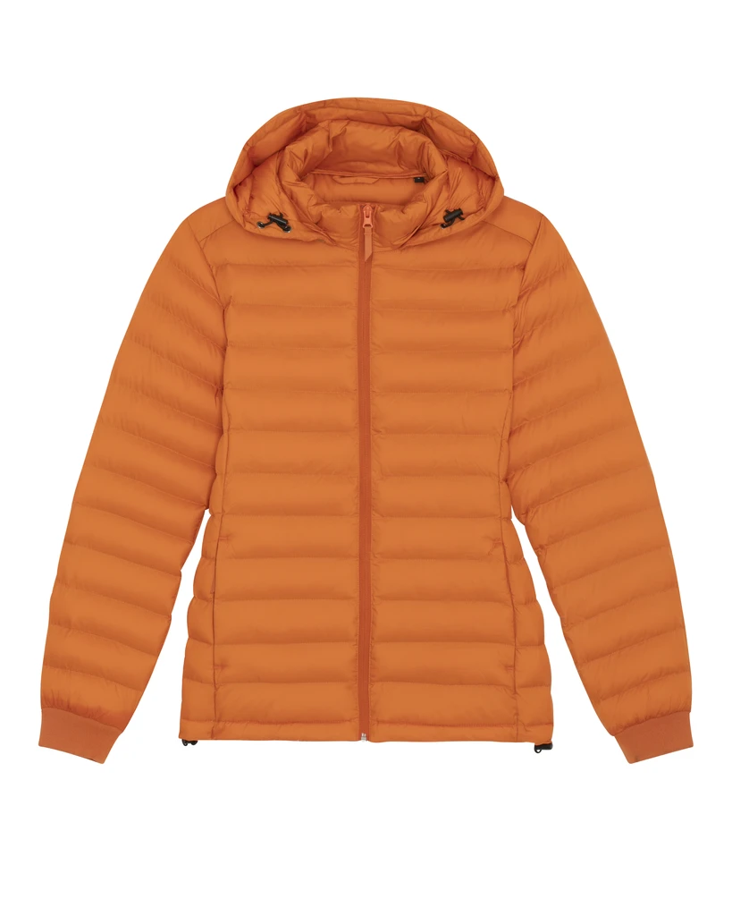 STJW839-flame-orangeDámská polstrovaná bunda Stella Voyager Materiál:100% recyklovaný polyester, DWR bez fluoru; Gramáž: 75g/m²; Přiléhavý střih, vsazené rukávy, vysoký límec s odnímatelnou kapucí a skrytými patentky z matného kovu, zapínání kapuce a spodní lem s nastavitelnou plastovou zarážkou a elastickou šňůrkou, reverzní nylonový zip vpředu uprostřed, průhmatové kapsy na zip s přídavným stahovákem, celoprošívaná, boční panely pro lepší tvar, 1x1 žebrování u lemu rukávů, uvnitř vázané švy; Certifikáty: Global Recycled Standard (GRS), Fair Wair, STANDARD 100 by OEKO-TEX®, Peta - Approved VEGAN