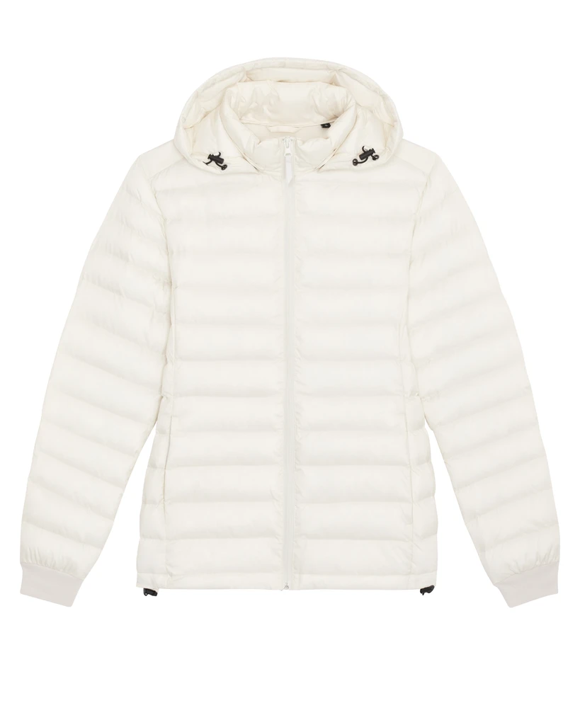 STJW839-off-whiteDámská polstrovaná bunda Stella Voyager Materiál:100% recyklovaný polyester, DWR bez fluoru; Gramáž: 75g/m²; Přiléhavý střih, vsazené rukávy, vysoký límec s odnímatelnou kapucí a skrytými patentky z matného kovu, zapínání kapuce a spodní lem s nastavitelnou plastovou zarážkou a elastickou šňůrkou, reverzní nylonový zip vpředu uprostřed, průhmatové kapsy na zip s přídavným stahovákem, celoprošívaná, boční panely pro lepší tvar, 1x1 žebrování u lemu rukávů, uvnitř vázané švy; Certifikáty: Global Recycled Standard (GRS), Fair Wair, STANDARD 100 by OEKO-TEX®, Peta - Approved VEGAN