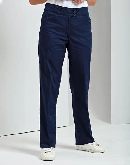 Kalhoty Premier ‚Poppy‘ mají překřížený pas se zapínáním na dva knoflíky a zip pro pohodlné kalhoty, vhodné pro dlouhé směny ve zdravotnictví.