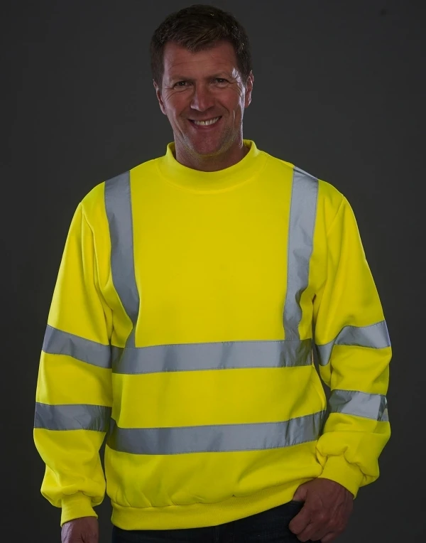Pracovní mikina s horizontálními a vertikálními reflexními pruhy vpředu a vzadu, široký náplet kolem výstřihu, u rukávů a dolního okraje, boční švy.