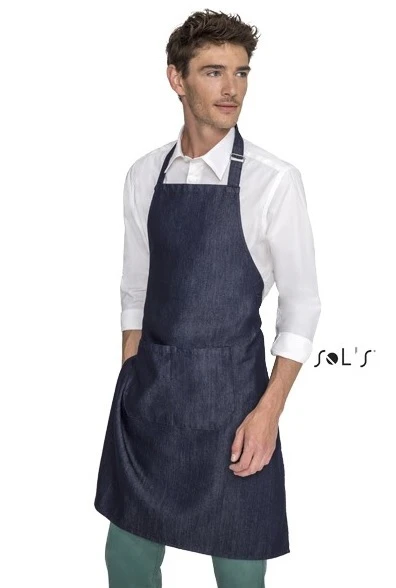 KVALITA: DENIM 8 oz - 70% bavlna, 30% polyester; Přírodní denim, velká přední kapsa rozdělená na 2 části, nastavitelná délka za krkem (kovovou spona); Rozměry: 90 x 75 cm